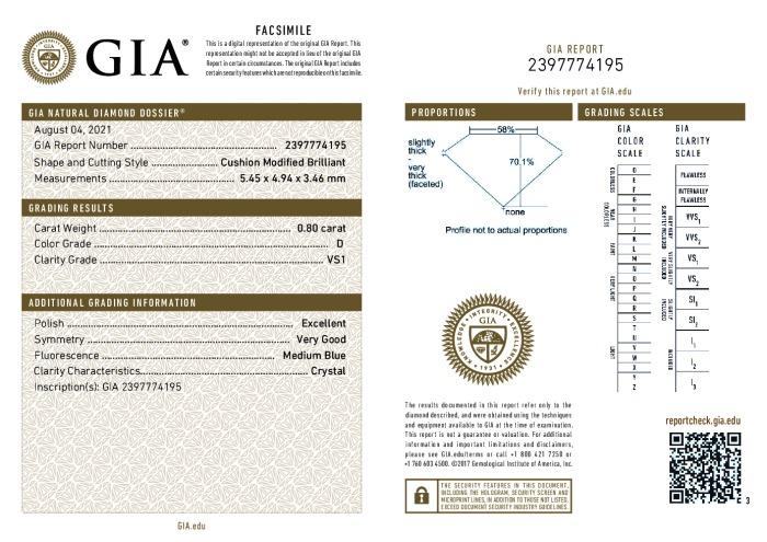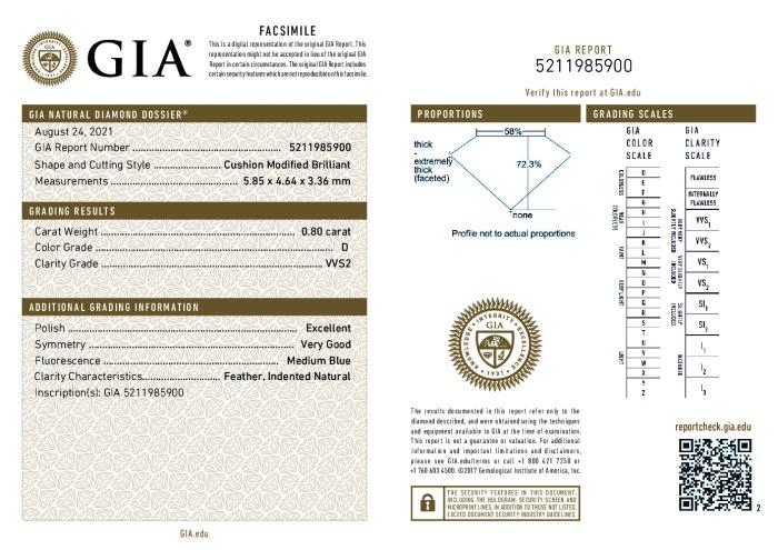 | 0.80 | Cushion | D | VVS2 | GIA | 72.3 | 58 | 5.85x4.64x3.36 | Contact Vendor |