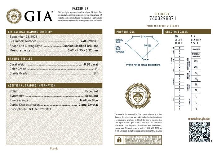 | 0.80 | Cushion | F | SI1 | GIA | 70.0 | 61 | 5.69x4.75x3.32 | Contact Vendor |