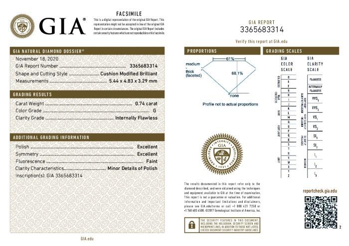 | 0.74 | Cushion | D | VVS2 | IGI | 66.9 | 61 | 5.28x4.99x3.34 | Contact Vendor |