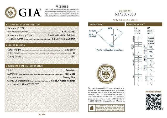 | 0.80 | Cushion | G | SI1 | GIA | 68.1 | 60 | 5.64x4.96x3.38 | Contact Vendor |