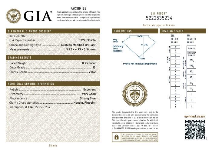 | 0.75 | Cushion | E | VVS2 | GIA | 71.7 | 59 | 5.22x4.93x3.54 | Contact Vendor |
