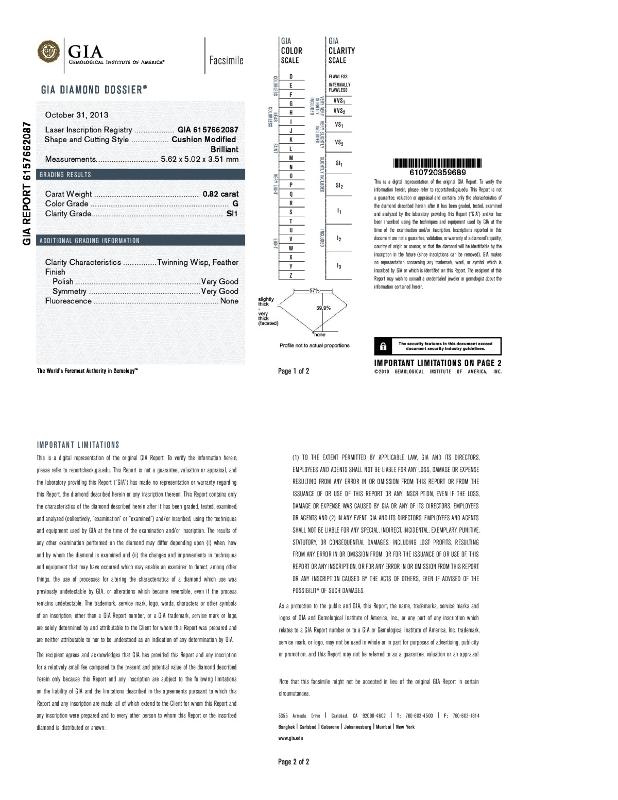 | 0.82 | Cushion | G | SI1 | GIA | 69.9 | 57 | 5.62x5.02x3.51 | Contact Vendor |