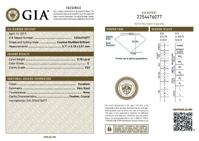 | 0.75 | Cushion | E | VS2 | GIA | 69.6 | 60 | 5.55x4.84x3.37 | Contact Vendor |