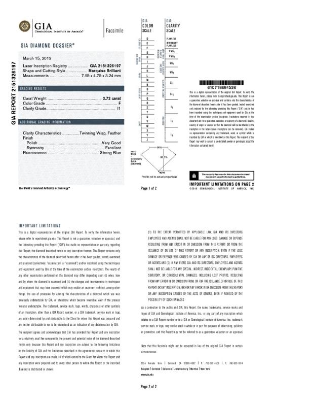| 0.72 | Marquise | F | I1 | GIA | 68.3 | 56 | 7.95x4.75x3.24 | Contact Vendor |