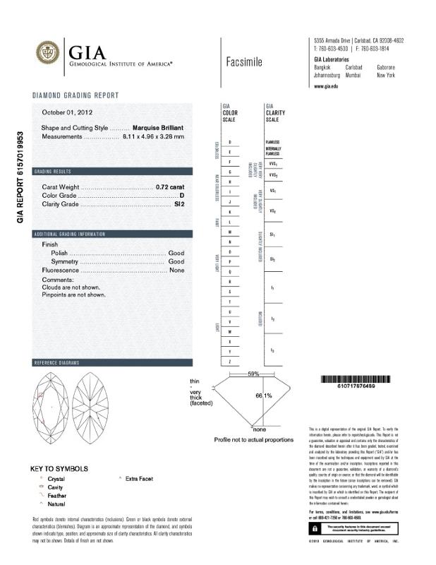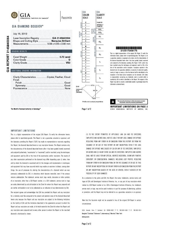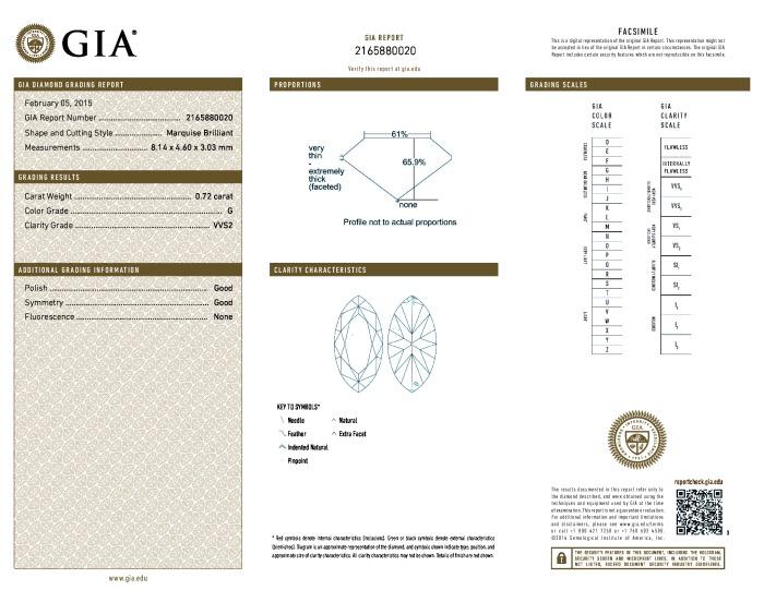 | 0.72 | Marquise | G | VVS2 | GIA | 65.9 | 61 | 8.14x4.60x3.03 | Contact Vendor |