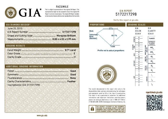 | 0.71 | Marquise | E | I1 | GIA | 65.7 | 57 | 8.00x4.55x2.99 | Contact Vendor |