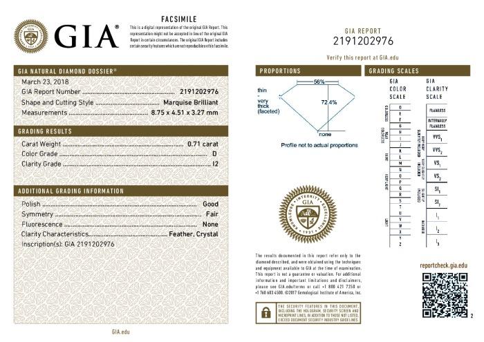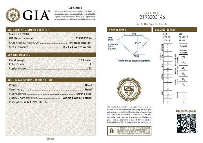 | 0.71 | Marquise | G | I2 | GIA | 74.9 | 53 | 8.46x4.36x3.26 | Contact Vendor |