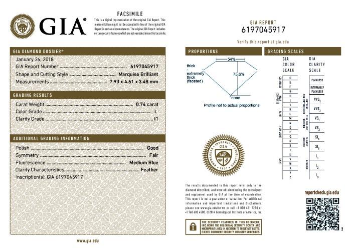 | 0.74 | Marquise | L | I1 | GIA | 75.6 | 54 | 7.93x4.61x3.48 | Contact Vendor |