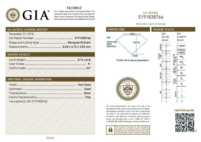 | 0.74 | Marquise | K | SI1 | GIA | 64.0 | 56 | 8.48x4.73x3.03 | Contact Vendor |