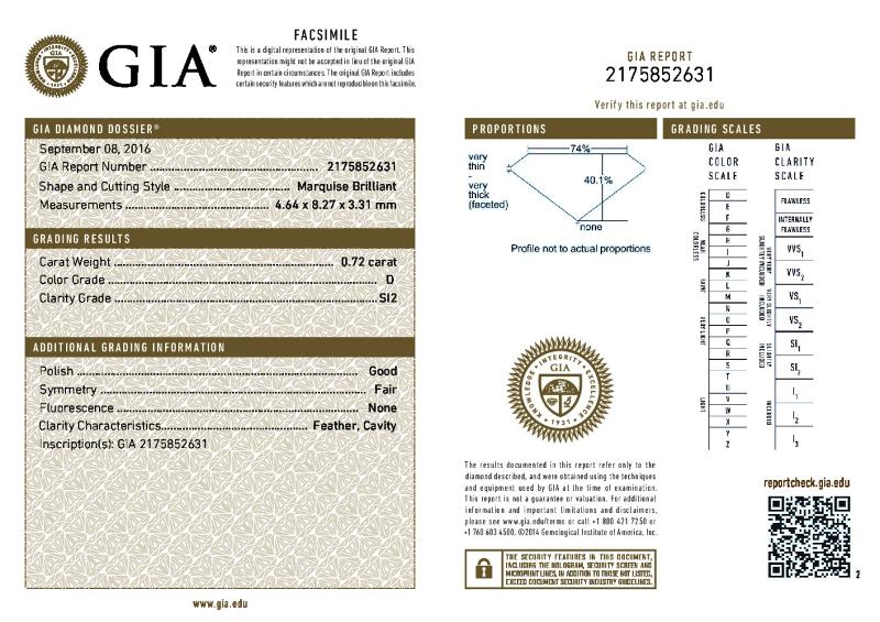 | 0.72 | Marquise | D | SI2 | GIA | 40.1 | 74 | 8.27x4.64x3.31 | Contact Vendor |