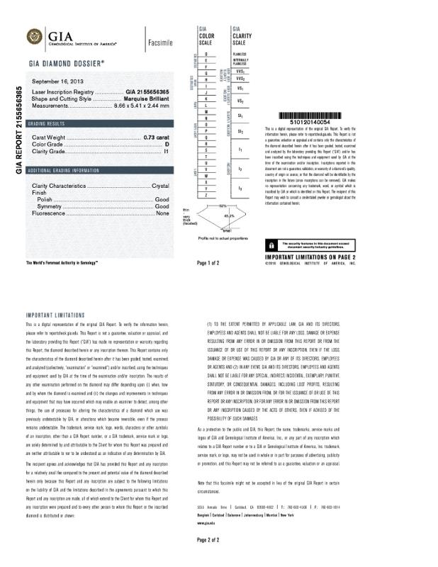 | 0.73 | Marquise | D | I1 | GIA | 45.2 | 62 | 8.66x5.41x2.44 | Contact Vendor |