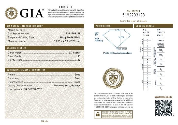 | 0.73 | Marquise | F | I2 | GIA | 57.3 | 57 | 10.21x4.79x2.75 | Contact Vendor |
