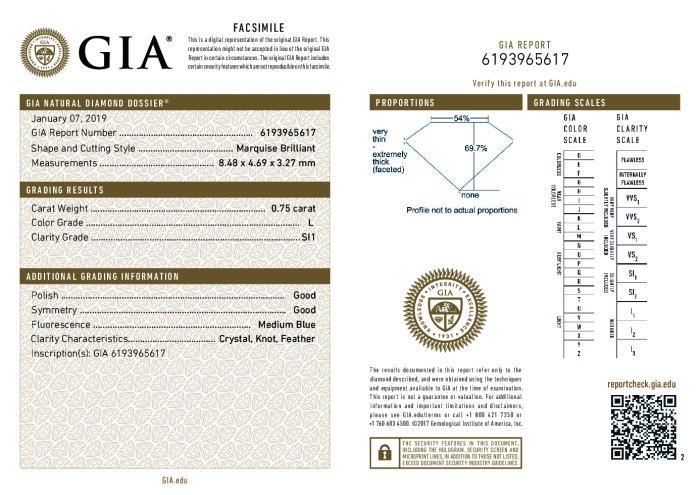 | 0.75 | Marquise | L | SI1 | GIA | 69.7 | 54 | 8.48x4.69x3.27 | Contact Vendor |